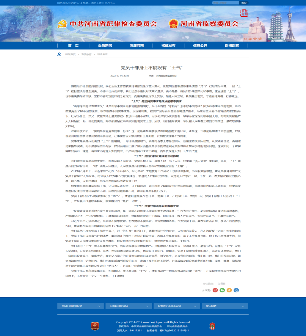 省紀委監委網站刊載服務區公司紀委《黨員干部身上不能沒有“土氣”》工作信息