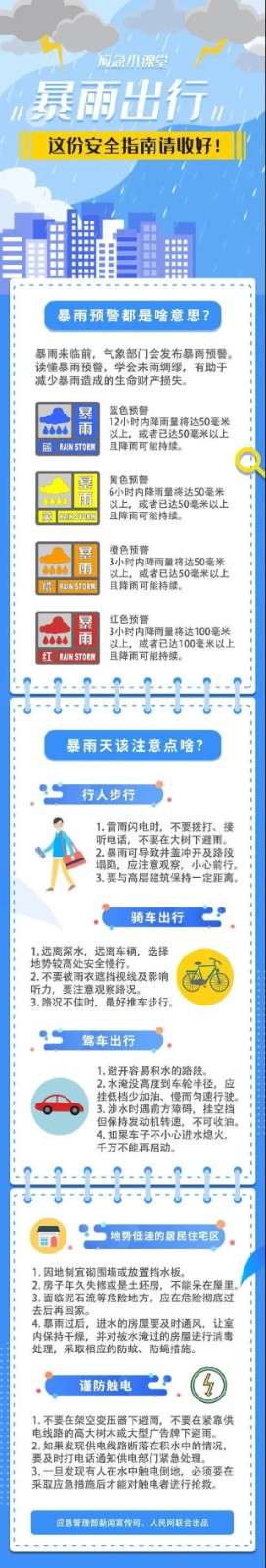 來源: 本站 發布時間: 2021-07-13近日,多地遭遇入汛以來最強降雨,中央氣象臺發布今年首個暴雨橙色預警,國家防總啟動防汛Ⅳ級應急響應。暴雨天出門防范有講究,這份暴雨天出行安全指南請收好。來源: "央視新聞"公號、@應急管理部 、映象網