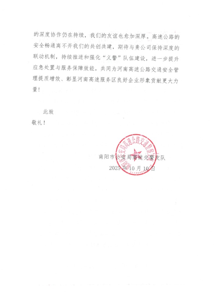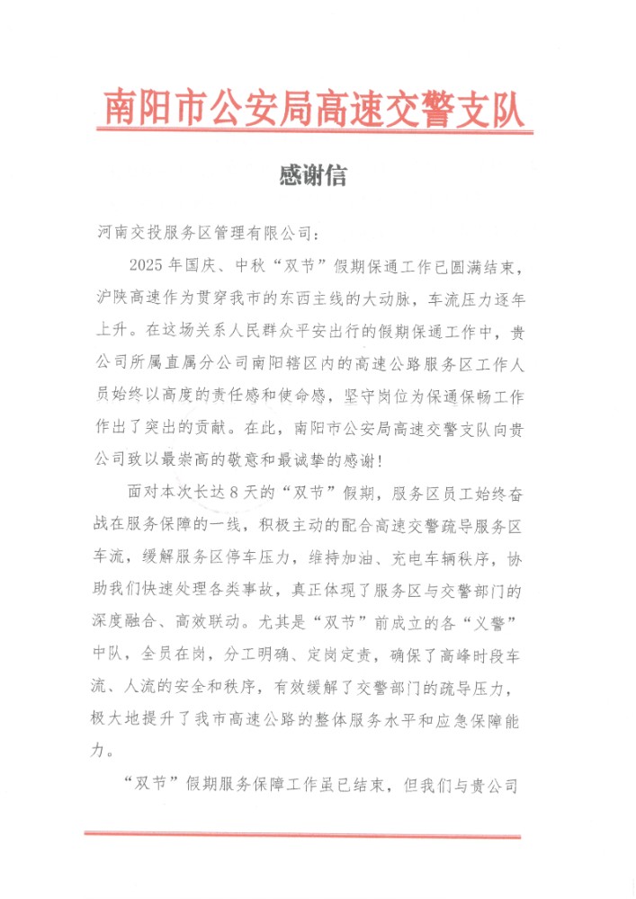 10月10日,南陽市公安局高速交警支隊向公司所屬直屬分公司寄來感謝信,表達(dá)對南陽轄區(qū)內(nèi)服務(wù)區(qū)、停車區(qū)國慶中秋“雙節(jié)”期間積極配合做好保通保暢工作的崇高敬意和誠摯感謝。